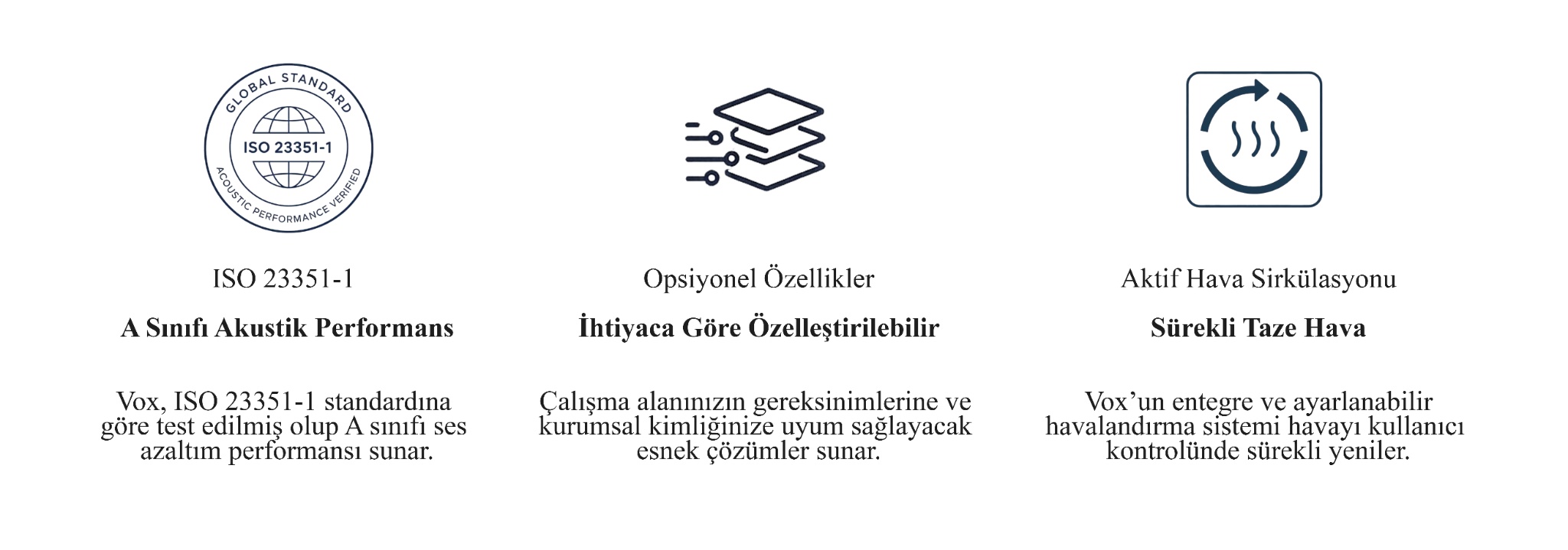 İki kişilik profesyonel görüşmeler için tasarlanan VOX Large Two Person, standart kabin anlayışının ötesinde daha geniş bir iç hacim sunar. Ferah ölçüleri sayesinde kullanıcılar sıkışmadan, doğal oturum mesafesinde ve konforlu bir çalışma düzeninde bir araya gelir.