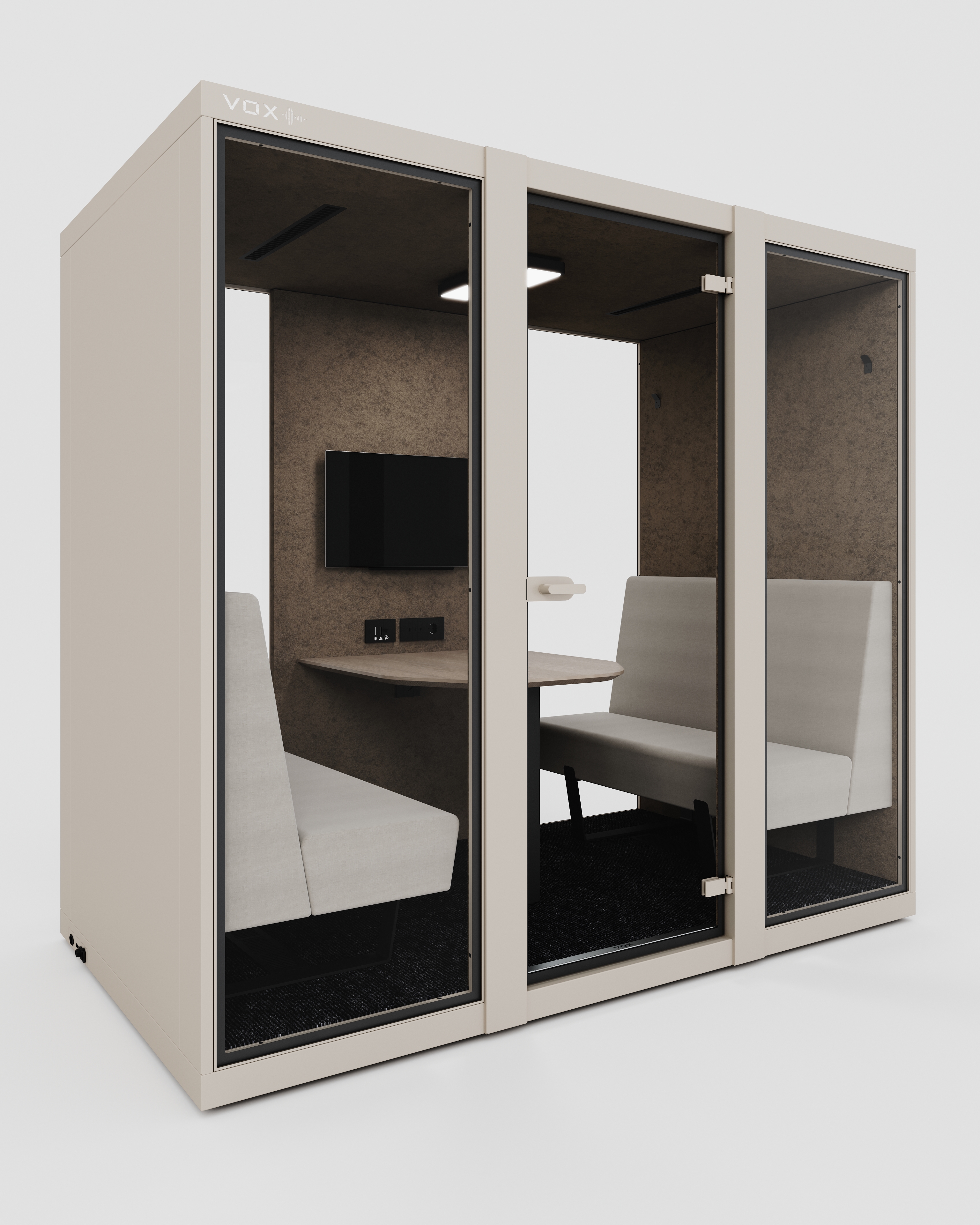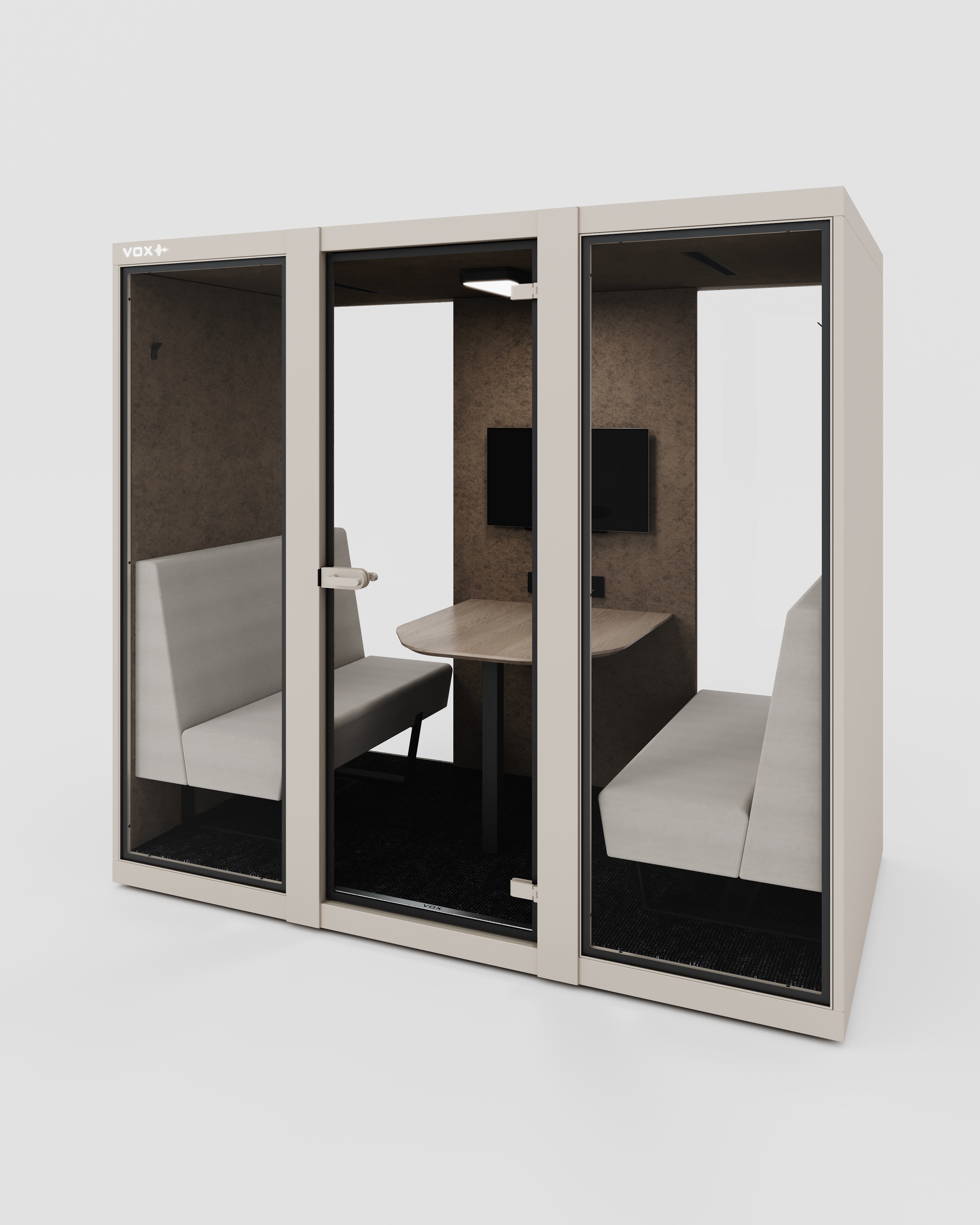 Large Kabin, ekip toplantıları, yüz yüze görüşmeler ve online konferanslar için optimize edilmiş geniş iç hacmiyle konforlu ve verimli bir çalışma alanı sunar. Karşılıklı oturum düzeni, ergonomik sedir yapısı ve entegre masa ünitesi sayesinde uzun süreli görüşmelerde bile maksimum rahatlık sağlar.